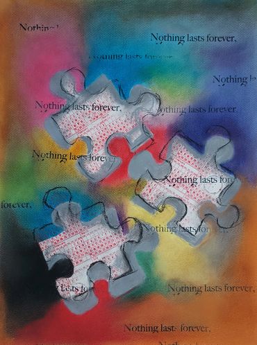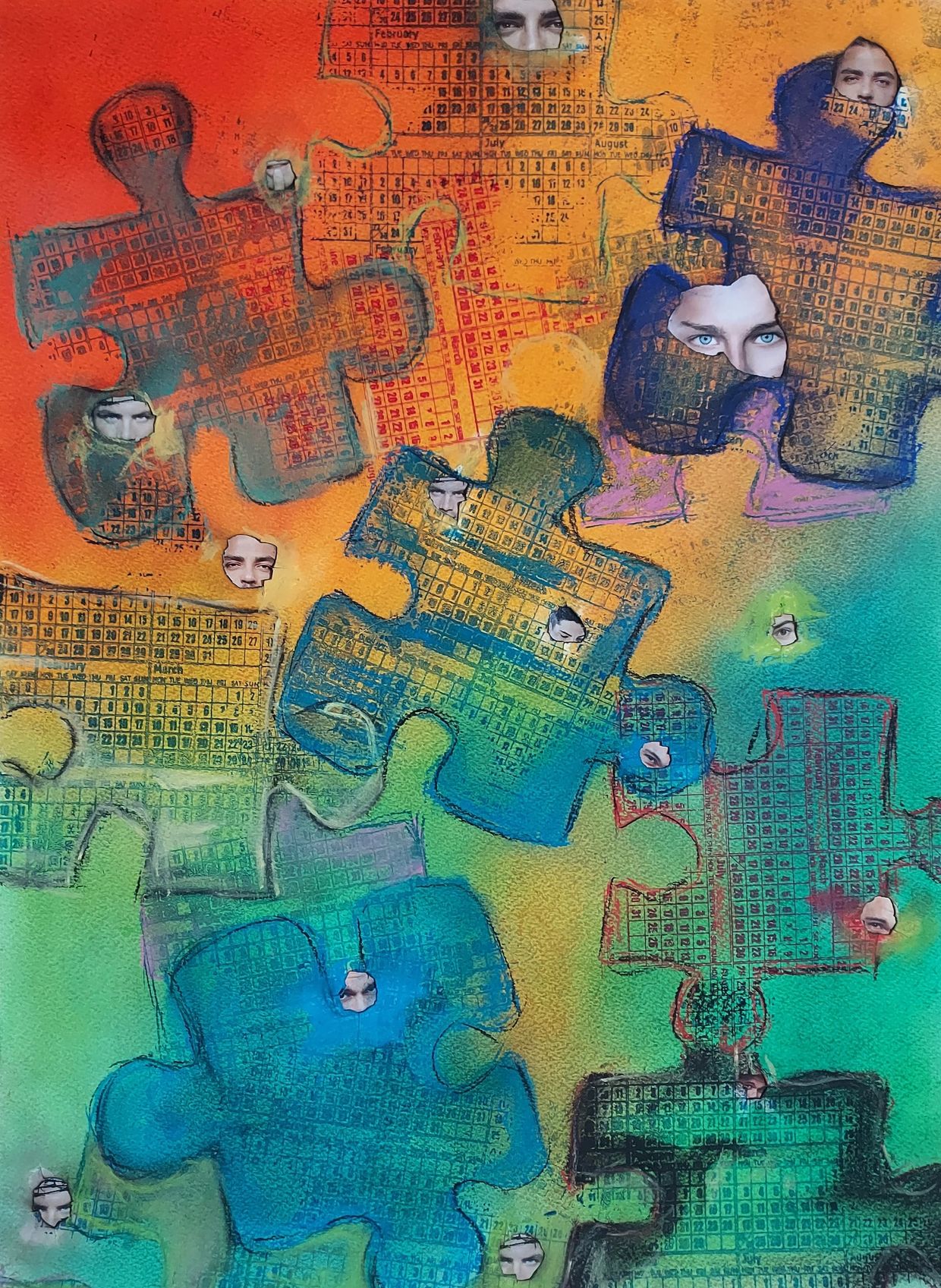 The Passage of Time 2019 to present: Today I again visit this series of collages. Incorporating the calendar, which represents the passage of time inside an iconic puzzle, I reflect on the widespread changes that are moving us backward rather than forward in the middle of a still-killer pandemic. Sharp political division looks to severely divide Americans: dictating women’s rights over their bodies, oppressing gay education at schools, halting progressive changes to help minimize climate change, even prohibiting the showing the nude figures in art venues. It seems we now live in a nation that almost childishly changes its clothes on a whim (or every time a political party comes into office) and simply refuses to grow up.